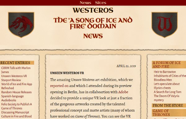 Westeros is a website where you will find reviews, forums, preview, etc. This site is for everyone who wants to know more about the Game of Thrones. There is information about the show, number of seasons, casting, etc. There is also a dedicated information source for the original book by George R.R. Martin A Song of Ice and Fire. There are forums where you can interact with fans and share your theories as well as learn something new from other fans. You can also watch and read reviews of the latest episode by other experts or fans. You can also visit the gallery to see images from the latest episodes.
