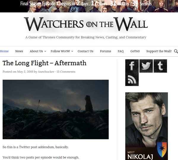 Watchers on the Wall is a great website for getting news about the show, information about the cast, forums to have meaningful discussions, read reviews or commentary by writers on the website. You can follow the website on various social media to get the latest info. When you open this website, you will see a countdown timer running at the top of the website. It is a countdown to the next episode airing time which you can see. There is video commentary by people, and episode previews are also available to see. You can also join in on live chats, or live discussions being carried out by the website.