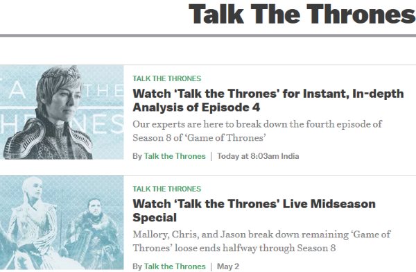 Talk the Thrones is a podcast dedicated to Game of Thrones. If you are a GOT fan then you will get a in-depth analysis of each episode through this podcast. You can also find news about the show, news about its actors, various theories floating around, etc. You can find a link for the podcast on the page, which you can easily watch by clicking on it. You can easily find out more about your favorite show and even learn about some theories which you didn’t know about.