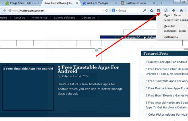 Image-Show-Hide works similarly to Image Block. After installing the addon, you’ll be able to add its icon to the Firefox top right corner addon section. It’s not added automatically.
