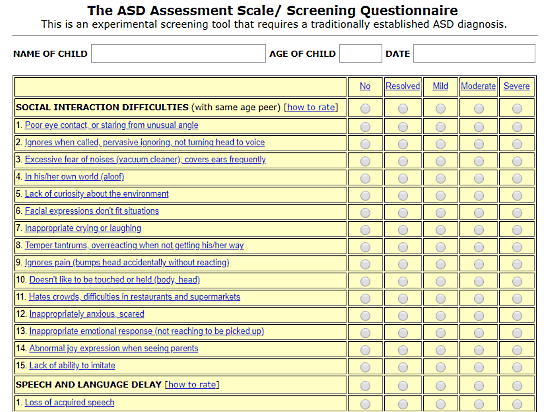 It has a Childhood Autism Spectrum Test (CAST) for ASD evaluation in a child. This test is generated by the Autism Research Centre at the University of Cambridge. The test contains 39 yes or no evaluation questions which asks you about the usual behavior, past habits and current habits of the child. Based on your responses to those questions, it gives you a score out of 31.