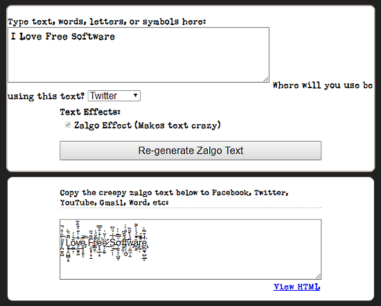 ZalgoTextGenerator.com is another free online glitch text generator website. With the help of this website, you can generate glitched text for social media platforms. Here, you can generate glitched text for Twitter, Facebook, Email, and others. To do that, simply paste or type regular text in the input textbox and select the desired social media platforms. After that, click the “Re-generate zalgo text” button to generate the glitched text. This will give you a glitched version of your regular text in the output textbox from where you can copy it to your clipboard. This website also generates an HTML code for the glitch text which you can use to embed the glitched text on webpages.