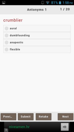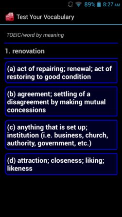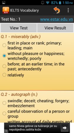 Image above shows the beginning of test number 1. Answers are multiple choice, and when you finish by tapping on the View Result button you’ll be given answers to see if you’ve solved the test (words) correctly.