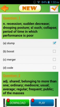 Test doesn’t require you to find word meanings, but to find antonym and synonym pairs. Each quiz has 20 questions, there’s around 250 quiz sets.