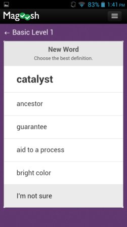 On the image above I’m going through a meaning > word test, where you’re given a definition and then your task is to match a word to that definition from the multiple choices down below. It’s possible to do the opposite where you’re given a word and then select the correct meaning from the offered multiple choices. Available games include anagrams, code words, who wants to be a millionaire, puzzles and more.
