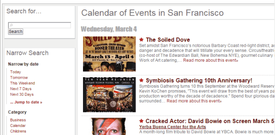 SFWeekly lets you filter the events in San Francisco by date, category, region, recommended, concert, club, canceled, or member’s pick. In the listing of events, you will find the event name, event image, and brief info. Click on the event name to read the complete description, see organizer’s website and user ratings (if any).