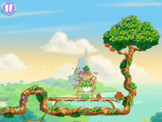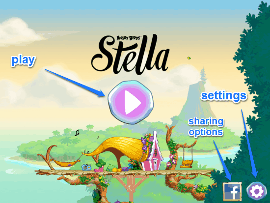 As illustrated by the above screenshot, the game’s initial loading/options screen is fairly simple, with the UI also reminiscent of the earlier Angry Birds games. There’s just a big Play button front and center of the screen. Apart from that, there are two icons on the bottom right corner: a Facebook icon for sharing the game on the popular social network, and a Settings icon to tweak in-game settings, such as audio, and view credits. Pretty simple stuff!