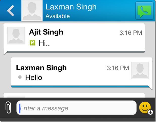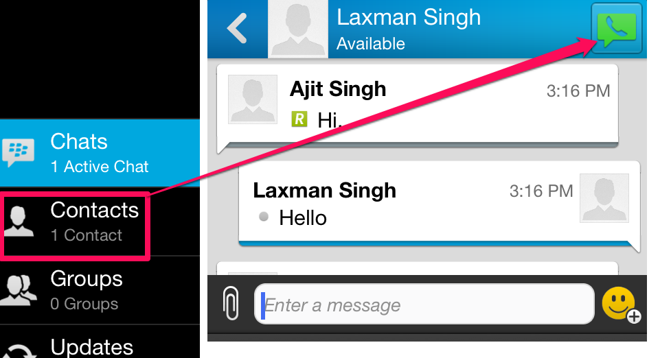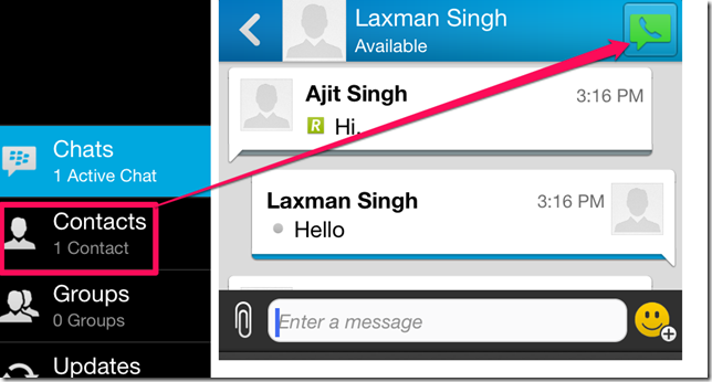 The BBM for iPhone also lets you make voice call to anyone in your contacts. To make voice calls, tap on the three bar icon at the extreme left followed by a tap on the Contacts. Now, tap on the contact with whom you want to do the voice call. The BBM will open the chat window with all the chat messages between the two of you, if any. Tap on the green color icon at the top right corner to make the call. All the calls made via BBM are done over the internet so that charges may be applied as per your internet plan.