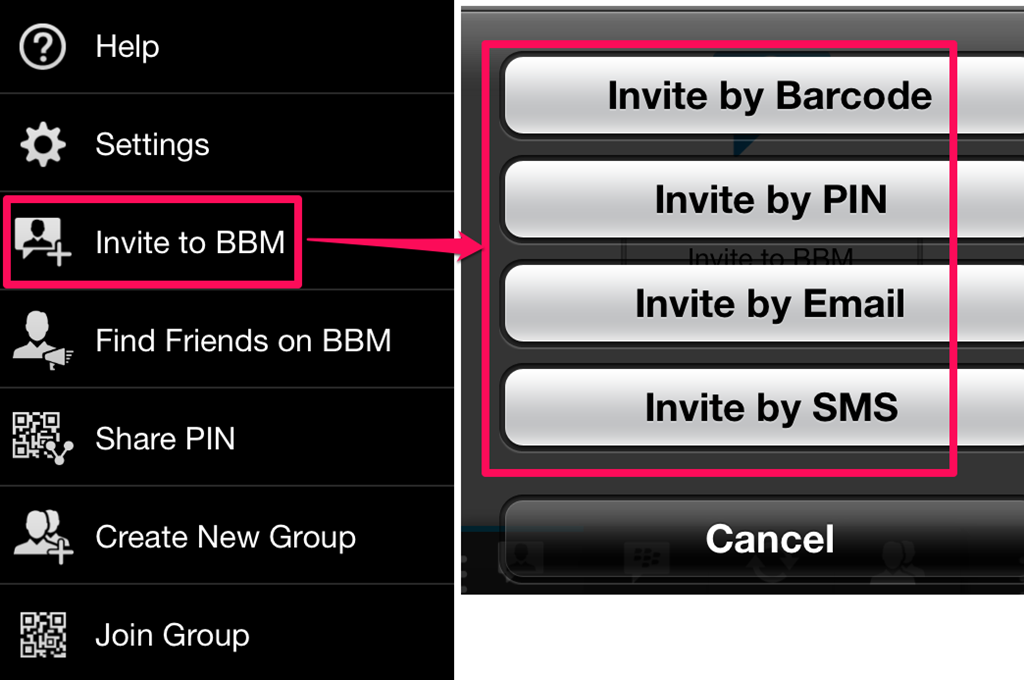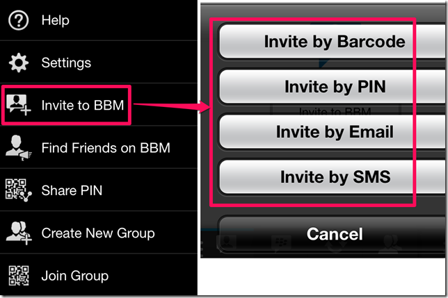 You can invite anyone to your BBM Contacts by tapping either on the icon at extreme left or right. Tap on the Invite To BBM option after tapping on any of the two options that I mentioned. You can invite anyone via Barcode, PIN, email, or SMS. Choose the option you want to use to send the invitation.