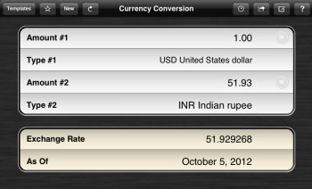 Currency Conversion is a template that allows you to calculate currency rates of different countries. To get started, tap on the template button and then tap on currency conversion. Now, select the home country and the country in which you want to convert the currency. Enter the amount which you want to convert and you are done with. Currency converter will also give you the exchange rate and last update date of exchange rate. This ensures you don’t need to install a separate currency conversion app for iPhone.