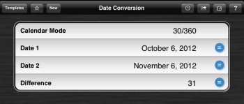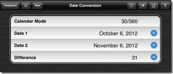 Date Conversion part of the app lets you calculate the difference between two dates. The app includes 4 calculator modes i.e., actual/actual, 30/360, actual/360, actual/365. Select the calculator mode, enter the two dates and you are done. The app automatically calculates the difference in two dates according to the calculator mode which you have selected.
