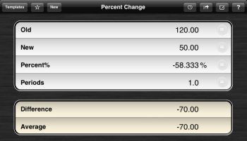 Percentage Change allows you to calculate the percentage change between two numbers on your iPhone. Just enter the old and new number and leave the rest to the app. The app will automatically calculate the percentage change between two numbers which you have entered. On top of it, the percentage change template also calculates the difference between two numbers and the average change.