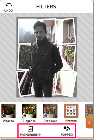 When you masks the photo, the app divides the photo in two parts: Background and Popped. Here, the Background part is the unmasked one while the Popped part is the one which you masked. So whenever you will add any effect to the photo, you need to select that whether you want to add it to Background or Popped part. You can select it very easily with just one tap from the same window of them which is being used to add effects. Just keep this thing in mind and add effects, frames and text to your photo just like any other app.