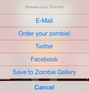 You can unleash all the zombies created via Facebook, Twitter, Email, or save them to your photo gallery. You can see on the above screenshot an option to order your zombie. This option lets you make a direct order from the app to get your zombie creation printed on tshirts, mugs, etc. This option did not work for me, so I’m not sure if its a problem with the app, or its a paid feature.