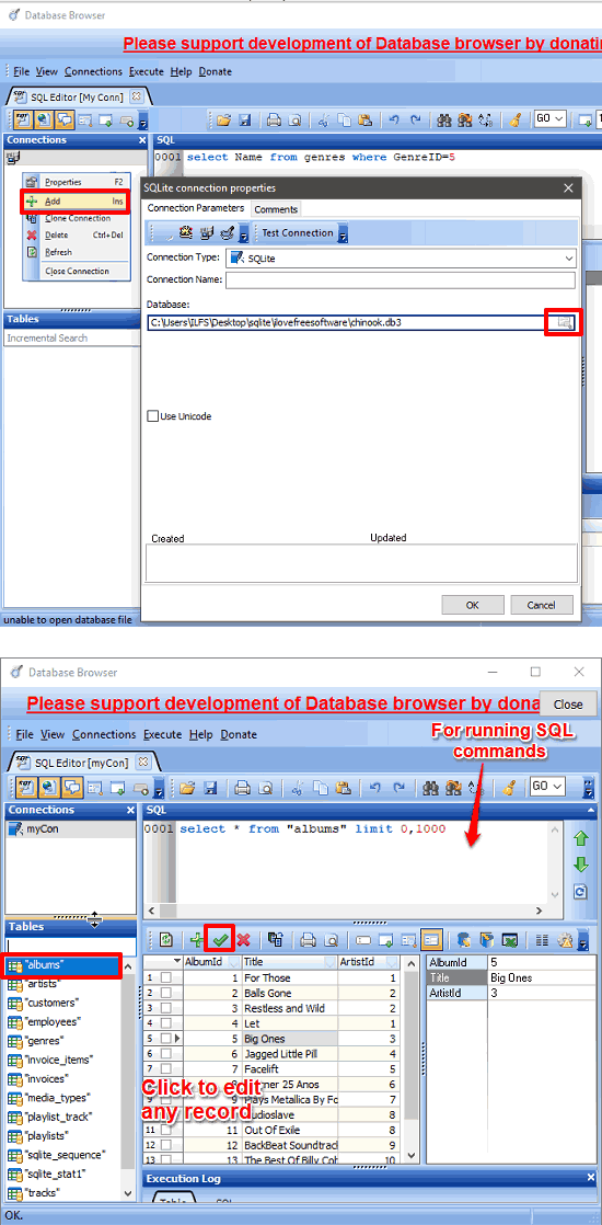 It’s pretty simple to edit SQLite database files using this software. All you have to do is just download it from its home page. After that, run it and make a connection to the SQLite database file. To do this, right-click inside the Connections section and then click on the Add option. A window will pop-up which you have to use to locate a SQLite database file. After a successful connection, the data tables from your database will be displayed to you. Click on any table name to open it in a pane where you can see it and also edit it. For editing, just click on any cell and edit it. When you are done editing records, simply click on the check sign from its toolbar to save changes. See the above screenshot.