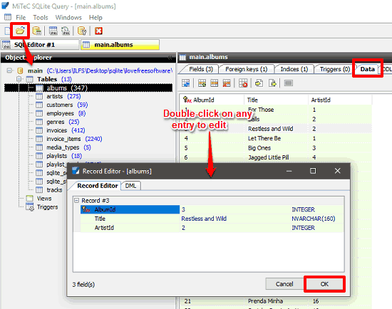 Using Sqliteman is very simple. After downloading the portable software from above URL, you can start using it. Use File>Open Database option to import a SQLite database and then it will list all the database components on the left side of its interface. You can see all the tables in the database, views, system catalog, etc. Double click on the table name and its data will be displayed in the bottom right side. To edit the table data, just double click on any cell to edit it.