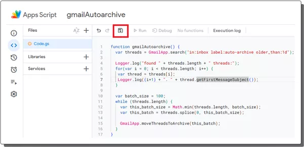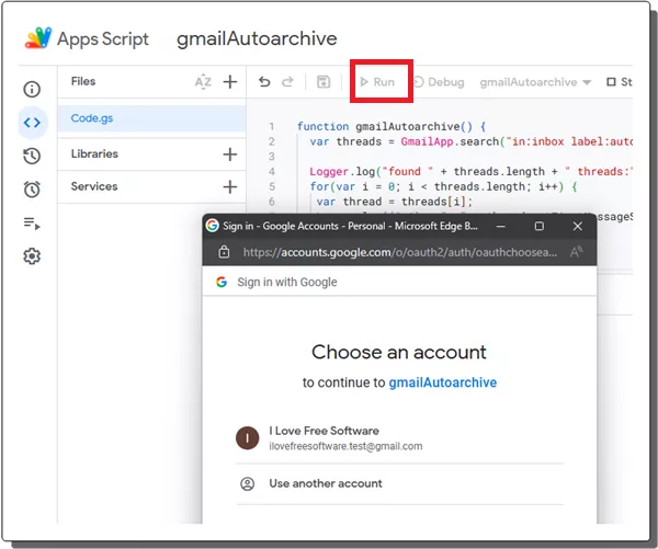 - Now click Run and then choose “gmailAutoarchive” function name. It will ask for Google authorization so allow it.