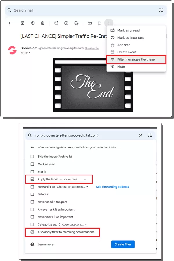 - Tap on 3 dots icon from the top side and then select the “Filter messages like these”. Next, you click on the “Create filter” option and then from the next window, select “auto-archive” label and also check the “Also apply filter too matching conversations” option.
