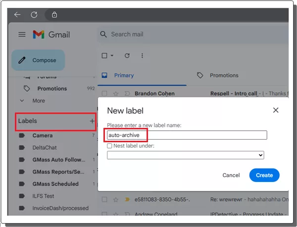 - Open Gmail and then create a new label called “auto-archive“. You can create it by clicking on the “+” icon in the Labels section in left side.