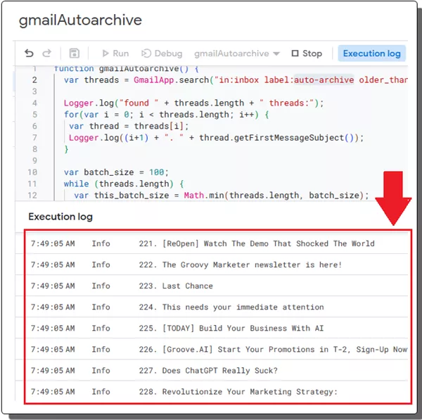 - If the run is successful, then you will see all the emails archived. You will see the subject lines. Also, when you visit the archived emails under the “auto-archive” label, you will notice that the inbox label is removed from it.