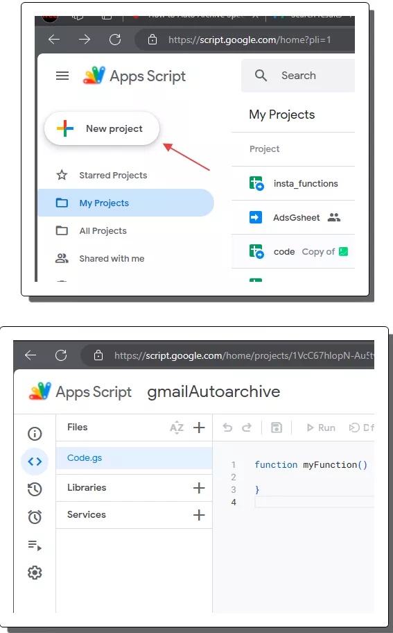 - Now, you need to visit script.google.com and create a new project. Give this project the name “gmailAutoarchive”.
