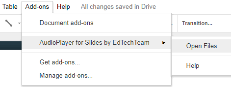 Step 5: To play audio with Google Slides presentation, click on the Add-ons menu → AudioPlayer for Slides by EdTech Team → Open Files option. This will open the sidebar of this add-on on the right side.