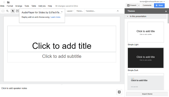 You might be wondering what’s the use of this add-on when we can play any track using some media player and then start Google Slides presentation. Well, the biggest advantage of this add-on is you are able to play audio with Google Slides even when you are using laptop/desktop of some other person. You just need to sign in to your Google account, open your Google Slides presentation, select a track stored on your Google Drive within the Google Slides, and play it. You don’t need to leave your Google Slides to play audio. Another benefit is, by default, there is no option to add audio to Google Slides. You can only add the link to some audio track or add a YouTube video to Google Slides. Using this add-on, you are able to play audio while working on your Google Slides.