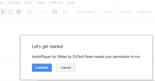 Step 2: After installing it, a new tab will open for Google Slides and this add-on will ask your permission to run. You need to click on “Continue” button to grant the permission.