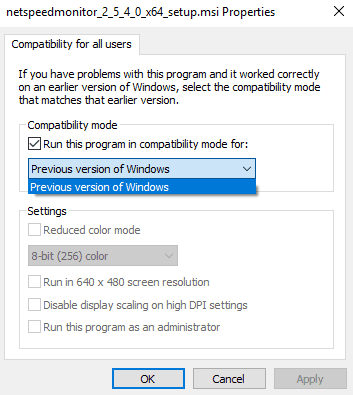 Once downloaded, change the Compatibility settings of its EXE file to run with “Previous version of Windows”. You can do it as follows: right-click on its EXE file and select Properties. After that, switch to Compatibility tab and then select “Change settings for all users”. This will pop up another Compatibility config dialog box as shown in the screenshot below. Enable “Run this program in compatibilty mode for:” option and select “Previous version of Windows from the drop-down list. That’s all you have to do to configure Compatibiltity settings of NetSpeedMonitor and after that you can move forward to install it.