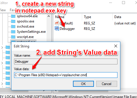 Step 4: Add a string in notepad.exe key with the name “Debugger“. Double-click that string to add Value data. The Value data must be “C:\Program Files (x86)\Notepad++\npplauncher.cmd“.