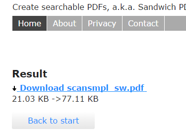Here is a free website, known as SandwichPDF, that turns your scanned PDF to searchable PDF in few mouse clicks. The maximum file size limit is 10 MB and you have the choice to upload PDF from PC or enter the URL of online PDF. The website uses the OCR technology, but in a smart way. Instead of fetching the text from PDF, it keeps the text within the PDF and generates a new PDF that lets you search as well as copy the PDF content.