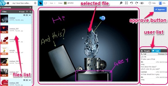 The files are displayed in the left Files and discussion pane. This files pane helps you add files, and then mange files like: filter files, search files, add more files, delete file, download file etc. Simply click on Add button on this pane to add files to share. The website provides filter options to filter the files either as approved or pending. The approved files are the ones which are approved by all participants, and they get a check mark after approval.