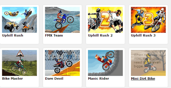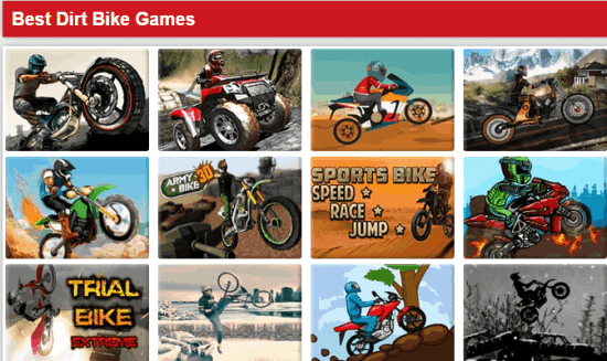As the name suggests, Free Online Games provides you with numerous online games across different genre, all of which are free to play. On the landing page, you will see the listing of all the free dirt bike racing games. The listing shows only the thumbnail image previews of each of the games and if you hover the mouse over the game, you can see its name. There are 60+ drift bike racing games for you to play.