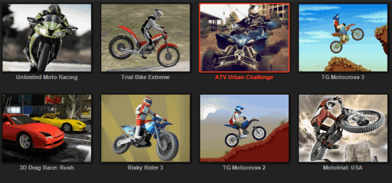 Wheelgamer is another website to play free dirt bike racing games. Like other websites, you will also find list of racing games with their name and thumbnail image preview. On the game playing interface, you will see the description, average number of ratings, and total number of votes. At the bottom, you will see the list of recommended games in the list which you might like to play.
