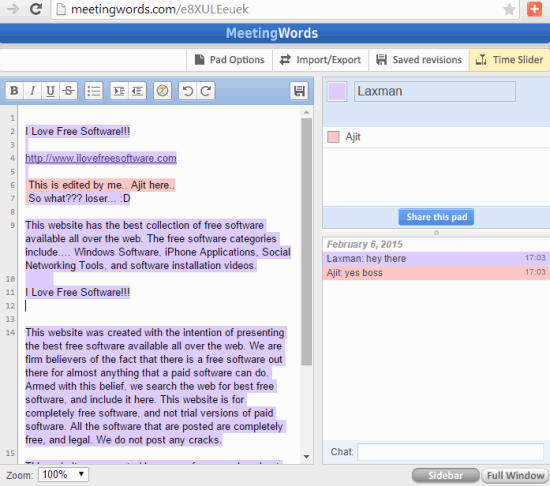 MeetingWords is one interesting website in this list and up to 32 people can collaborate together in a single document. Interesting feature of this online text editor is that collaborators can chat with each other that will make collaboration successful. Moreover, it also provides different color labels for all collaborators which will help to identify who edited the text.