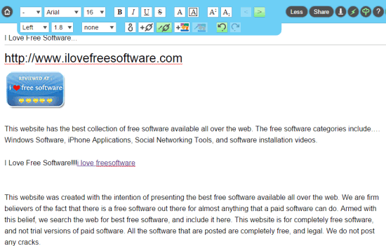 One more impressive feature of this website is that it provides a Time Slider. Using this feature, you will be able to play the recap of steps and see the changes made to document, like a video. Your document can also be exported to PC as bookmark file, plain text, and HTML document. It also lets you import a word, RTF, or HTML file, but unfortunately, this feature didn’t work for me. Still it is a very useful text editor.