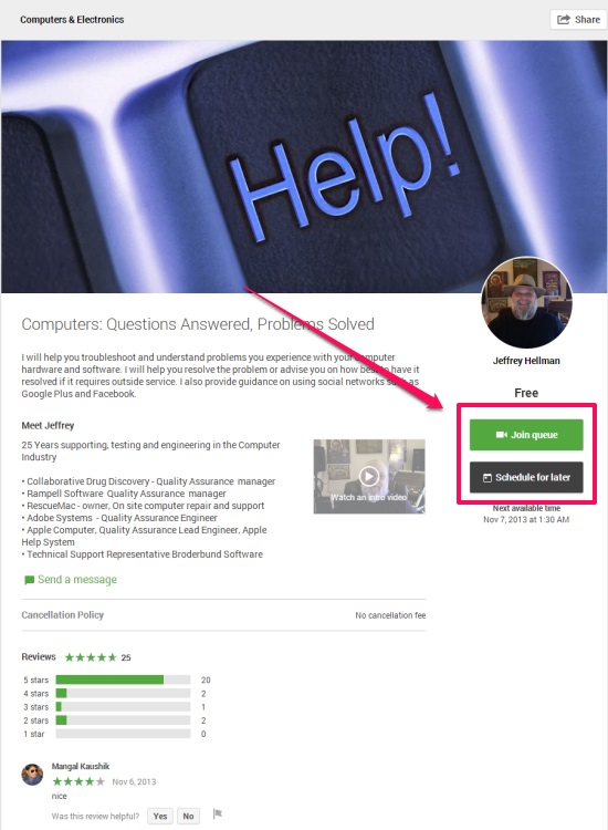 This will further take you to the expert’s page where you would find details on the expert’s educational/professional background, kind of help he/she could provide, and users’ reviews. This page also contains the expert’s photograph, an introductory video, link to his/her Helpouts profile, and options to join the help queue (applicable if the expert is online) or schedule a request.
