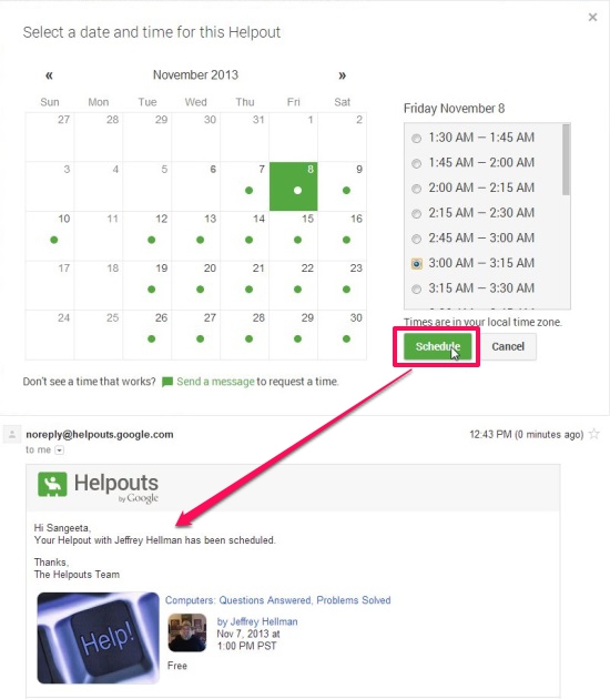 To schedule a help, click on Schedule for Later button and a calender would be opened showing the dates on which the appointment is available (marked with green dots). Click on the desired date and choose a suitable timing from the list on the right. Once this is done, click on Schedule button. If your appointment is scheduled successfully, you would see a notification bar at the top, and receive a confirmation mail in your registered Gmail inbox.