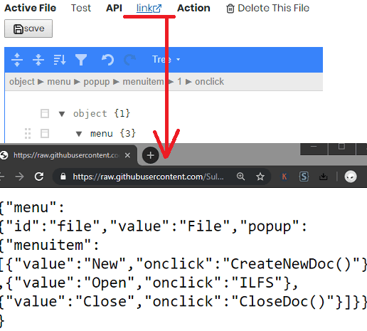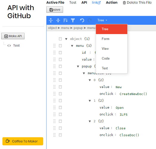 APIs With GitHub demands GitHub authorization and after that you can use its online JSON creator. It offers you an intuitive JSON editor that you can use to create any kind of JSON and then simply save it. Here it syncs the changes to GitHub repository and then you can fetch that whenever you want to. It offers different type of options to let you create the JSON data and then you can save it and generate the API URL. You can copy that and then you are free to do whatever you want.
