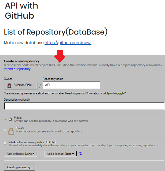 If you want to use an existing repository to save the JSON API then it is okay. Otherwise, you can create a new repository which will be used to keep the JSON files. The option to create a new repository is on its interface as well. And after you create a new repository, I will suggest you to initialize it with a “Readme.md” file.