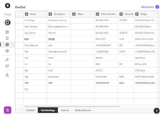 The Data option opens a spreadsheet; this sheet is actually saved in your Google Sheets. It contains 4 sheets but we only have to work with one sheet, YourMeetings. In this sheet, you can save your conference contacts with extension, name, phone number, and more. Initially, the sheet holds some sample contacts, you can replace them with yours.