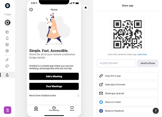 After adding the data, go to the last section (Share App) on the editor. This section gives you multiple options to install the app on your phone. You can either install the app by scanning the given QR code or enter your phone number to get a link via SMS.