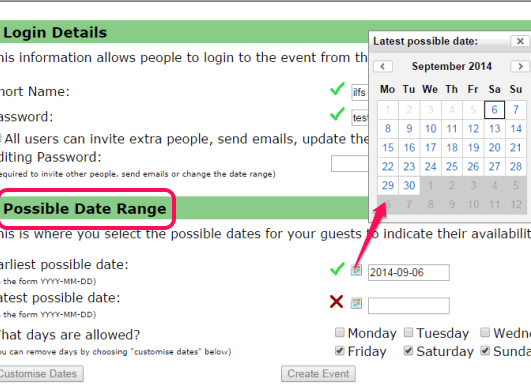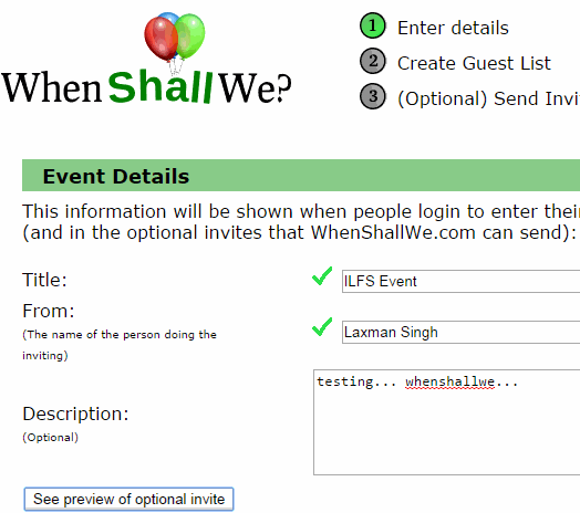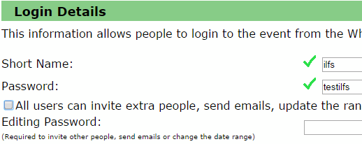 - Fill Login Details: This section helps to set short name and password of your event. As mentioned in the above note, these details are helpful to access your event to edit it whenever needed. Option to let users invite other people is also enabled (by default) in this section. But you can disable this option based on your requirement.
