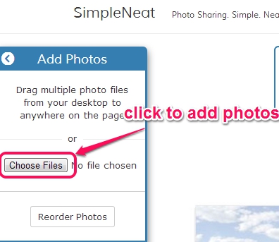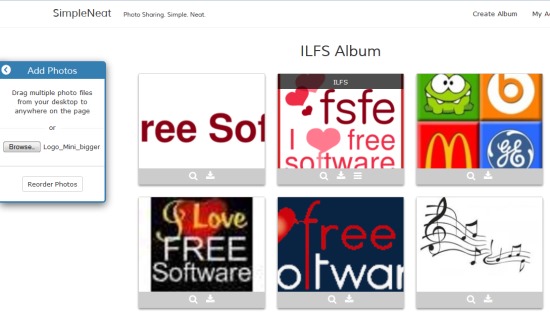 SimpleNeat is a very simple online photo sharing service that allows to upload multiple photos to share with friends, family, and with other people. You can add bulk photos in an album and a unique URL for each photo album will be created, which you can give to your friends to view that album. Not just they can see photos, they could even add their own photos to that album. You can set the authority whether others can add photos to your album or not. For each photo, you can also add title and description that can be edited by you anytime. But users won’t be able to like or comment on photos, as it is possible with many similar websites, like Marqueed, WebProjector, and LiveShare.