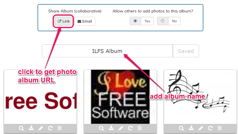 After uploading photos, you can use Link button that will provide the URL of uploaded photo album. This URL you can share with friends, or anyone you want. To let others add photos to that album, you can enable ‘allows others to add photos to this album‘ option, before generating the photo album link.