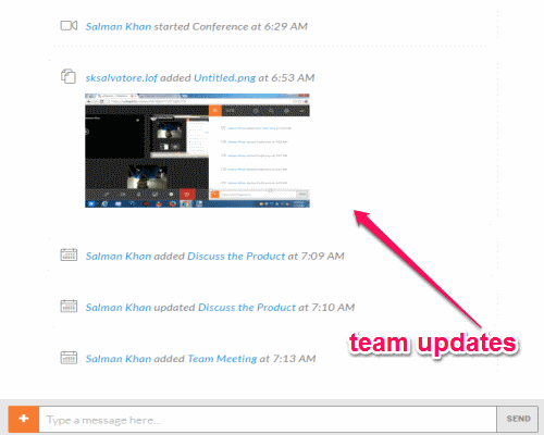 Step 4: It also shows updates for all the team related activities you do such as when you and your team members create a new task, schedule meeting, share an image, send text messages, etc. Ultimately, it is a common platform where you and your teammates can discuss something, share files, see updates, chat, etc.