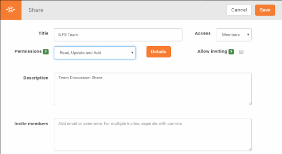 Step 2: To create a new team or Share (as they call it in the application), simply click the “New Share” button on the left panel. Then enter the team title, choose access (either as members or public), set up permissions (either as read only, read & update, read/update/add, or custom), enable allow inviting option (other users can invite and add members to the team), enter a description, and type email addresses of users whom you want to add to the team.