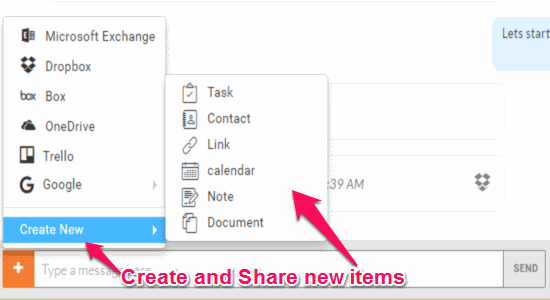 If you want to simply discuss anything with your team, then you can use the chat function and send text messages to others. You can also share various files (like documents, images, etc) from different cloud services like Dropbox, Box, Google Drive, OneDrive, Trello, etc. In addition to that, it allows you to create and send various new items like a task, contact, link, calendar, note, and document. Let’s say you want to discuss something with your team at any specific time, then you can go ahead and schedule a meeting by adding team members.