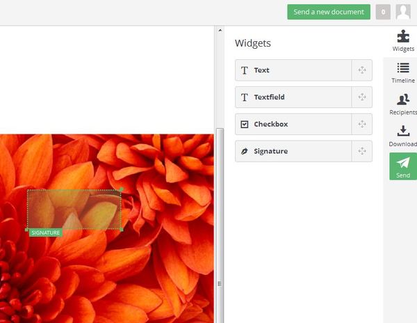 Don’t forget to add contacts to your account by clicking on the Contacts button from the left sidebar. Once the file is uploaded, you will be able to edit it. In our case we uploaded an image and as you can see we can add text, text field, check boxes and signature boxes.