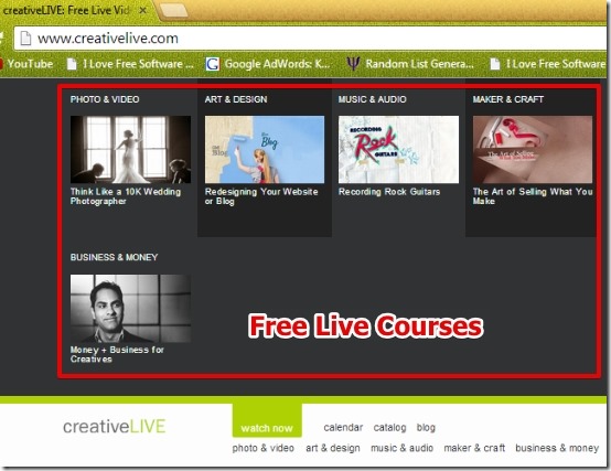 creativeLIVE is free website in which you can watch free online courses that are broadcasted live. In creativeLIVE there are different types of courses that range from photo and video, art and design, music and video, business and money, and many other topics.